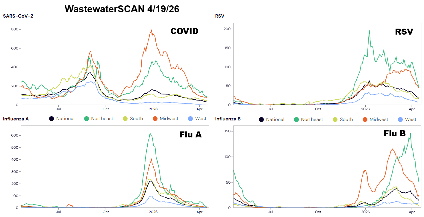 Regional wastewater levels for COVID, RSV, Flu A, Flu B: