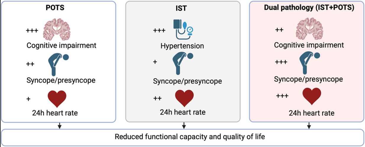 A study of 270 Long COVID patients referred for tachycardia showed that postural orthostatic tachycardia syndrome (POTS) or a combined dual diagnosis of POTS and inappropriate sinus tachycardia (IST) were more common diagnoses than IST alone in Long COVID. IST patients were more likely to have high blood pressure, while POTS patients showed higher rates of cognitive impairment, fainting, and nausea.