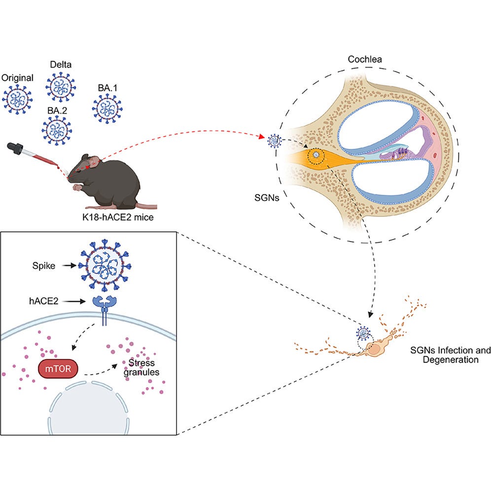 A study from Huazhong University showed that SARS-CoV-2 can invade the cochlea directly in mice, killing the spiral ganglion neurons (SGNs) responsible for transmitting sound. Rather than causing damage through inflammation, the spike protein appears to trigger this cell death by disrupting the normal function of stress granules.
