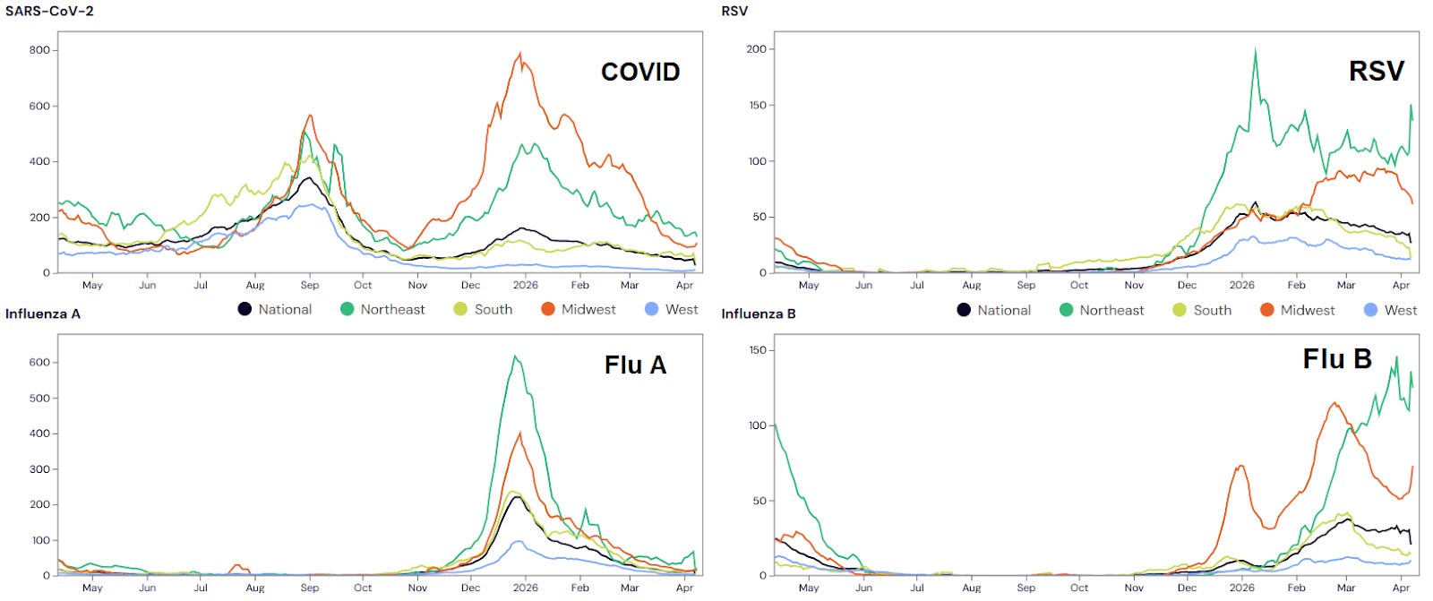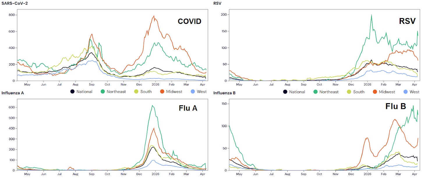 Flu A is low overall, and Flu B varies by region, but is still high in some places like the Northeast.