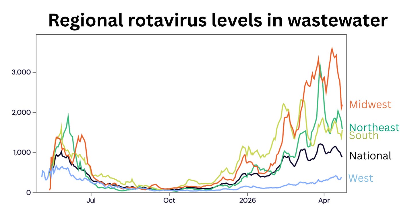 Rotavirus (a contagious gut virus and the leading cause of severe diarrhea in young children) is generating headlines, with levels higher than last year. Wastewater monitoring shows a striking signal, though this monitoring technique is relatively new for rotavirus, making interpretation difficult. CDC test positivity rates (a more established metric) are modestly elevated compared to last year.