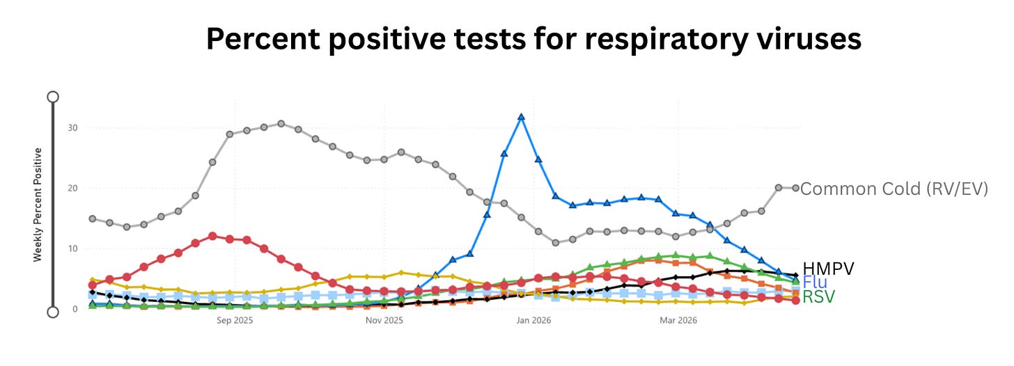 If you’re sick right now, it’s almost certainly a common cold. Rhinoviruses and enteroviruses dominate this time of year, and everything else—flu, RSV (which had a notably late season), and Covid—is finally declining for the first time in a long time!