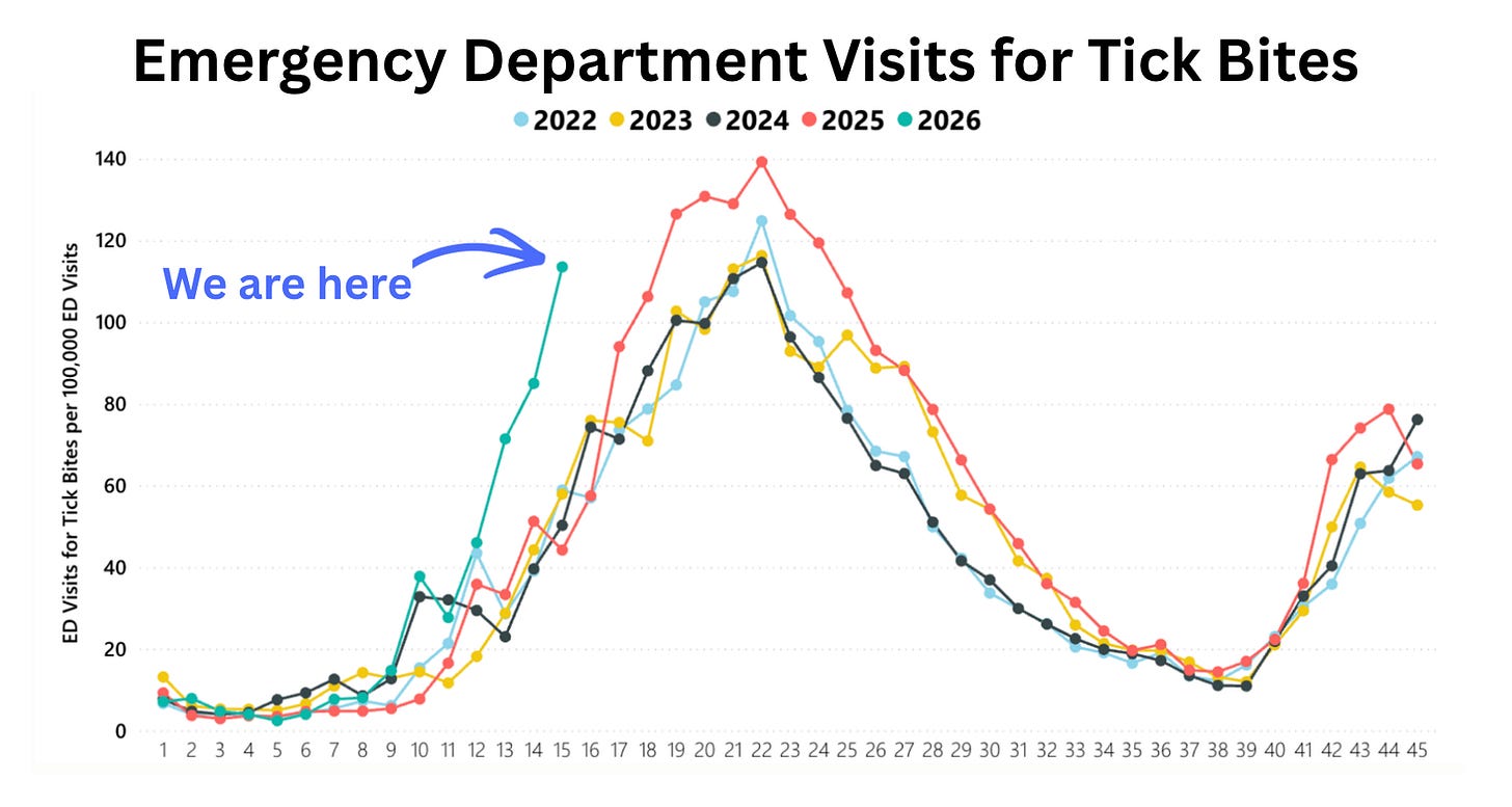 Well, it wasn’t a blip. Tick season really is off to an unusually bad start. Emergency department visits for tick bites are running at roughly 114 per 100,000 people per week, nearly triple the typical rate at this time of year (44 per 100,000). The Northeast is bearing the brunt of it, with the Midwest running a close second.