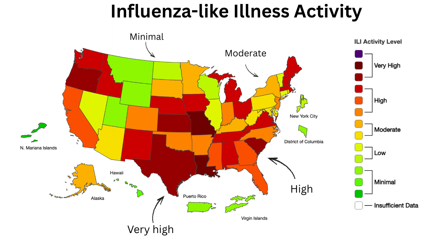 Seasonal influenza activity remains elevated nationally. After three weeks of decreasing cases, flu cases increased
