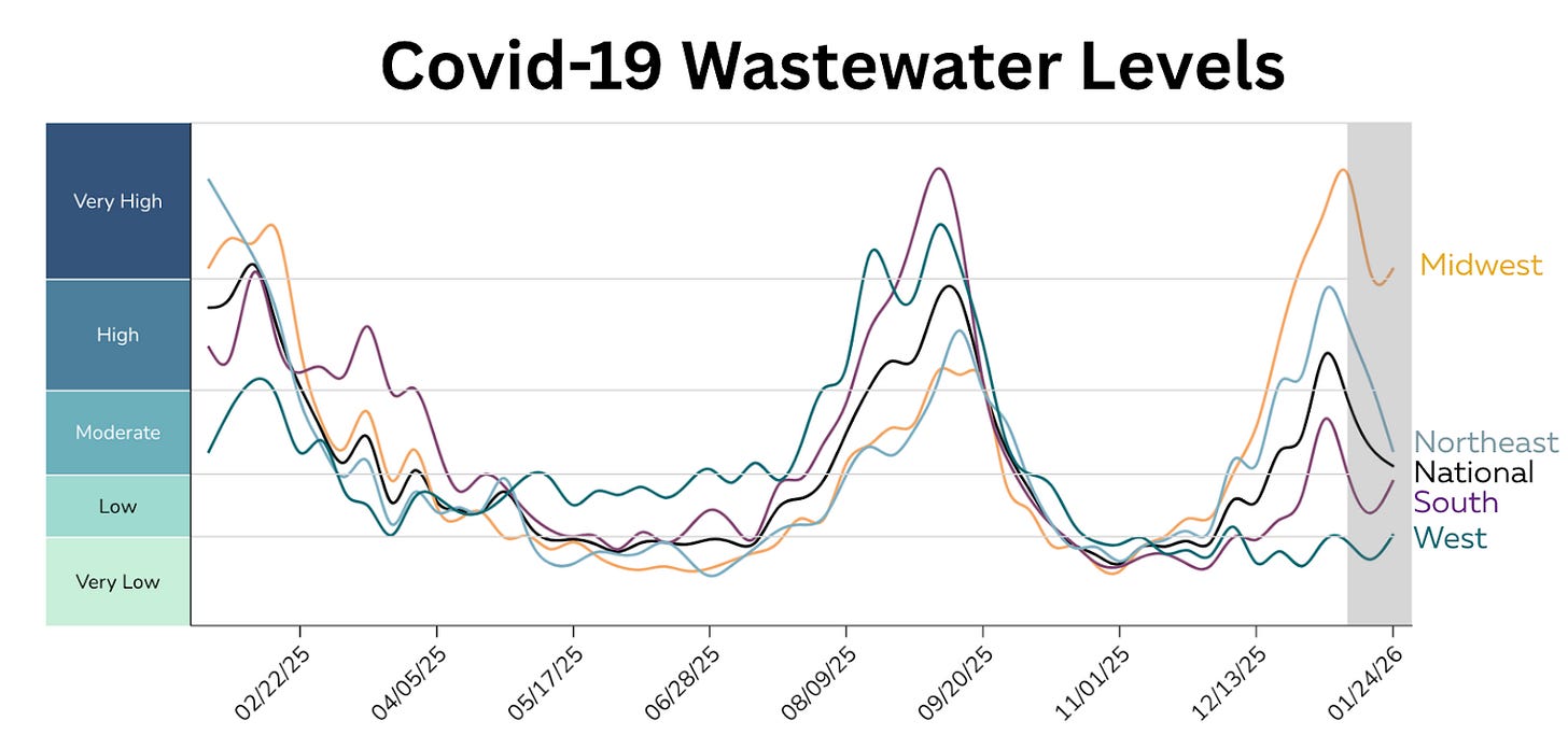 TL;DR: The Midwest and Northeast have high levels of COVID. Flu had peaked, but looks like there may be a second wave starting which is common for influenza. RSV