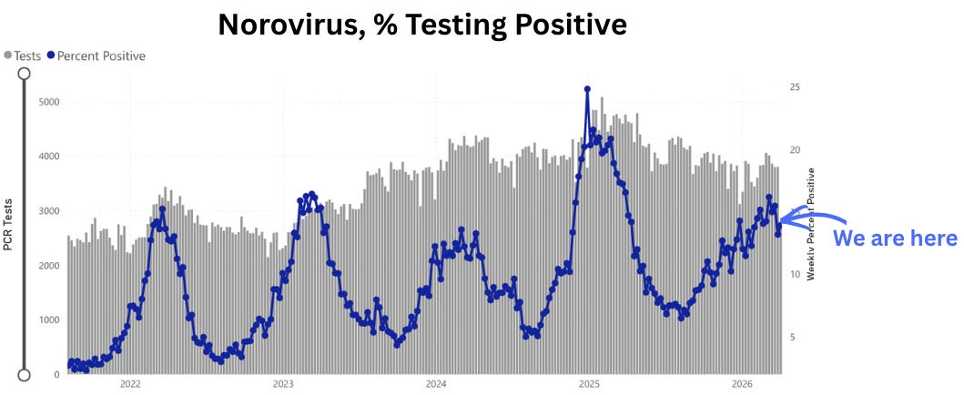 Norovirus (think diarrhea, vomiting, and nausea) is currently at its seasonal peak. There are early signs of a decline, but it will likely take another month or two to come down meaningfully.